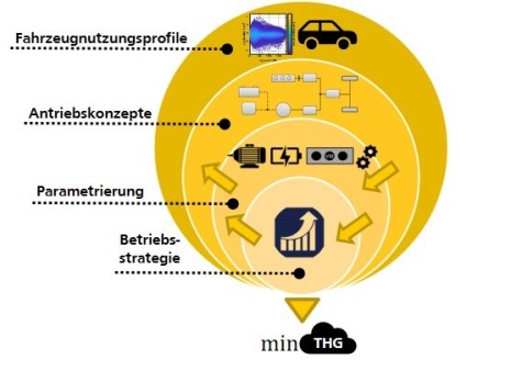 Um einen belastbaren Vergleich zwischen verschiedenen Antriebskonzepten zu ermöglichen, wurde am IMS eine ganzheitliche Optimierungsumgebung aufgebaut (DrOPs: Driving-optimal Powertrains). Für eine bestmögliche Vergleichbarkeit werden stets einheitliche Anforderungen, Nutzungsprofile und Randbedingungen zugrunde gelegt. Innerhalb der Optimierung wird eine Gütefunktional-basierte Betriebsstrategie eingesetzt, um das quasi-optimale Betriebsverhalten für jede Antriebsparametrierung zu ermitteln. Durch die Bestimmung der optimalen Auslegung und Betriebsweise jedes Antriebskonzepts entsteht eine einheitliche Bewertungsbasis, die den belastbaren Vergleich verschiedener Antriebskonzepte unter gleichen Anforderungen ermöglicht.